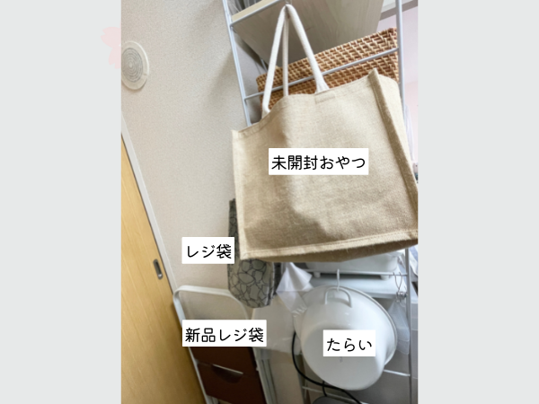 レジ袋やお菓子バッグ、たらいまで引っ掛けています。
